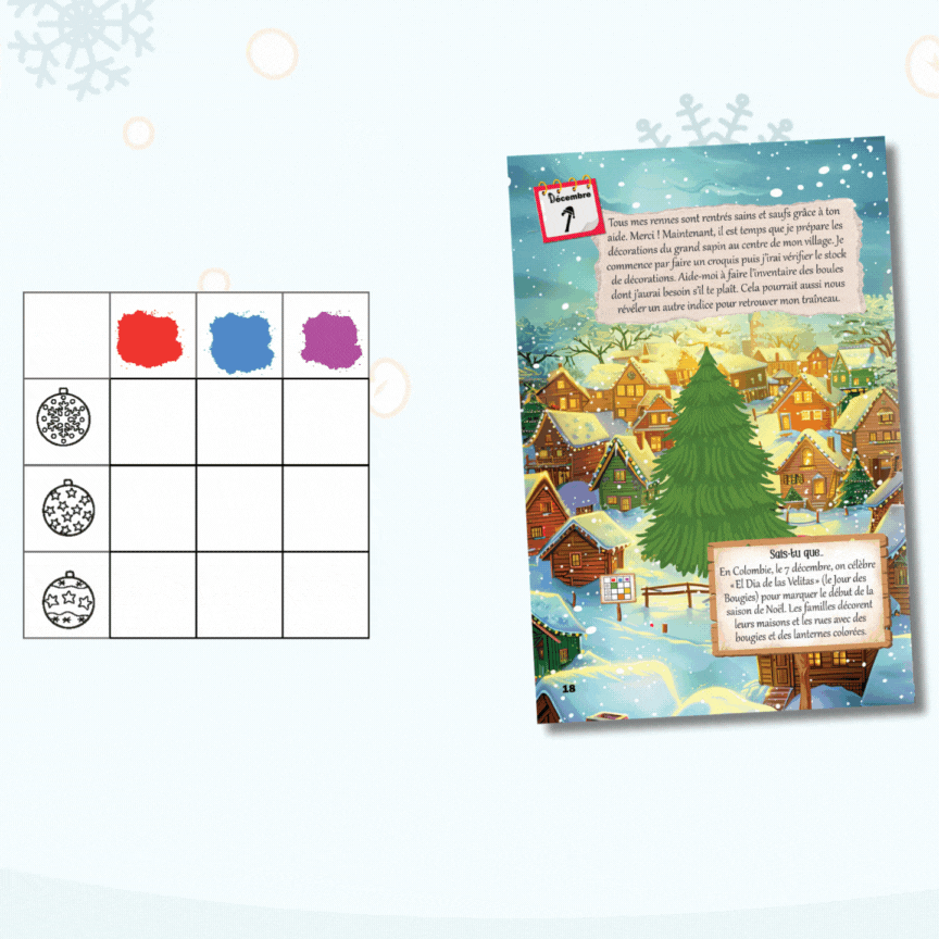 Associe chaque motif à chaque couleur. Puis compte le nombre de boules de chaque type que tu vois sur le dessin du sapin.